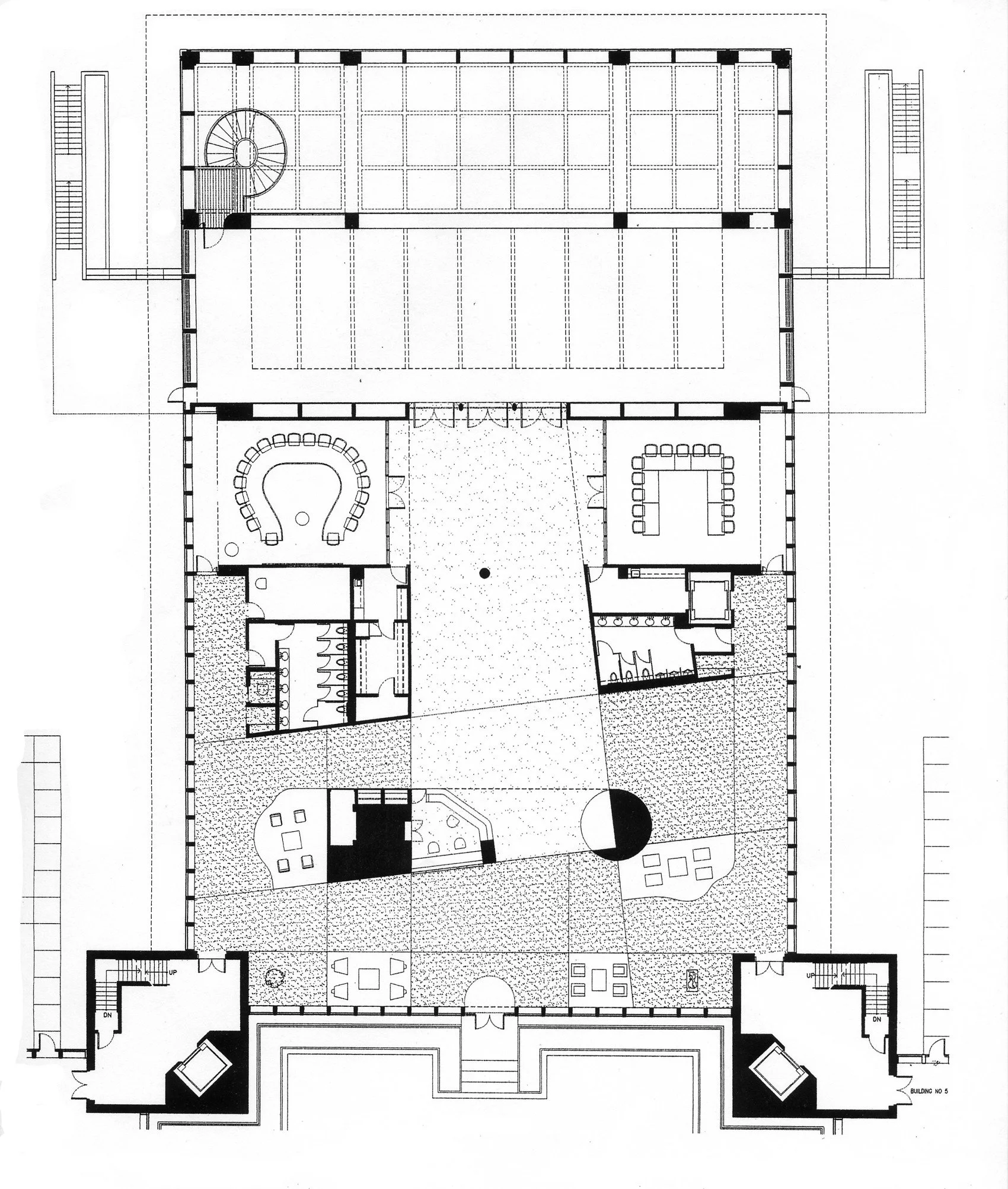 This particular component of the multi-phased renovation is illus- trated on these two pages. The extension of the middle building a cafeteria and dining hall, required a careful examination of build- ing assemblies of the 1960’s. Once we explored the exterior mate- rials and researched the ability to recreate the look a parti was developed. The buildings geometry dictated a stepping structure shown at the right in a series of plans that was expressed horizon- tally in one direction. This move allowed a sympathetic siting of the building in an highly articulated park and sculpture garden.